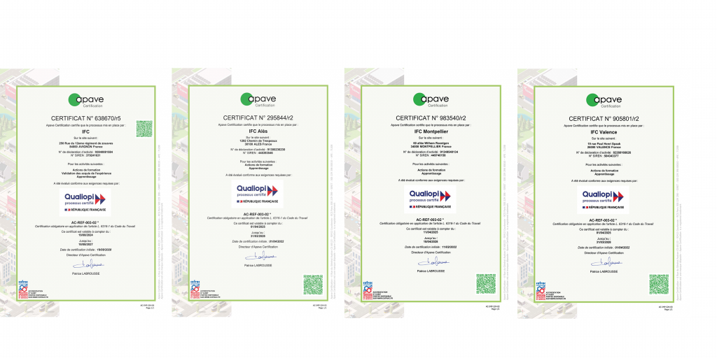 Le groupe IFC a obtenu pour l’ensemble des campus la certification QUALIOPI par Apave et conforte ainsi la reconnaissance du groupe pour la qualité des prestations mises en œuvre.